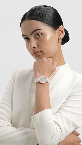 A sophisticated timepiece crafted with a beige dial enhanced by rose gold hands and stick markers. A crystal embellishment adds a refined sparkle, while the rose gold case with a matching beige bezel elevates its modern appeal. The durable pink ceramic strap ensures both comfort and lasting wear, making it a versatile accessory for everyday elegance and formal occasions.