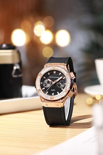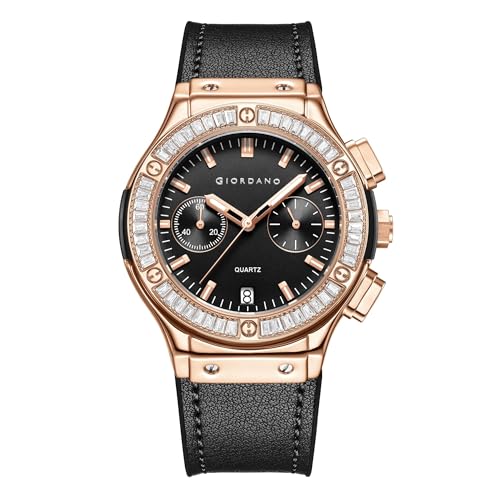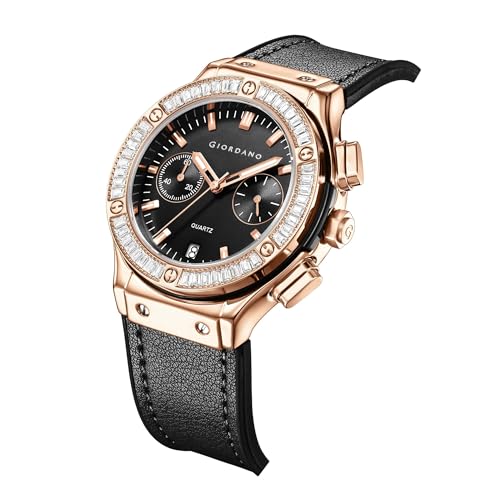 Giordano Analog Watch for Women – Round Dial, Leather Strap, Crystal-Studded Bezel with Quartz Movement