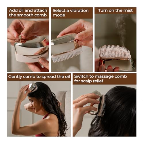 User-friendly Operation: Attach the smooth comb for mist-infused hair care or the massage comb for scalp therapy. Select your preferred vibration mode, activate the mist if desired, and gently comb or massage to nourish, detangle, and relax.