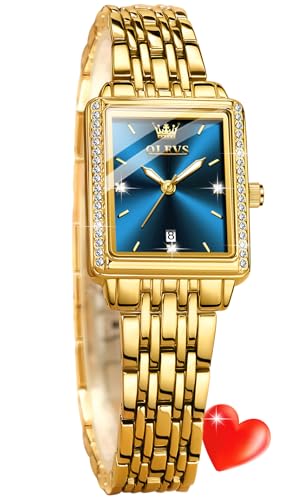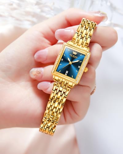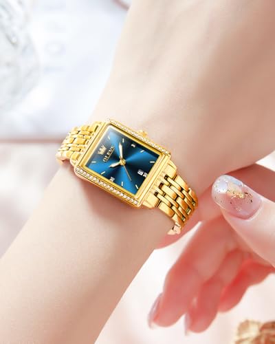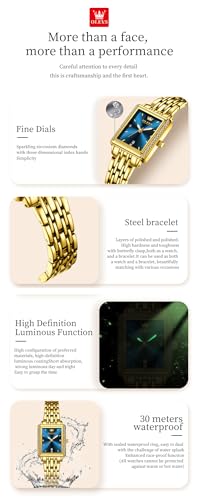 OLEVS Gold Watches for Women Original Luxury Small Square Diamond Wrist Watch Analog Quartz Stainless Steel Waterproof Stylish Ladies Watch Date