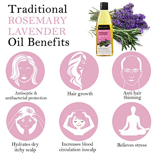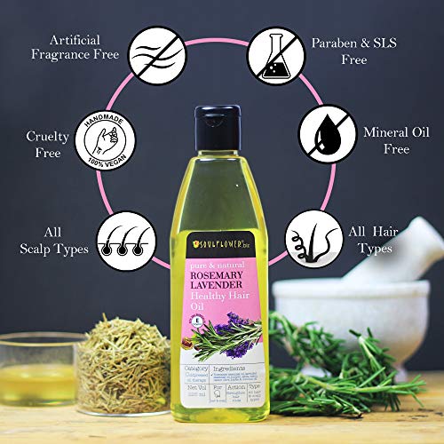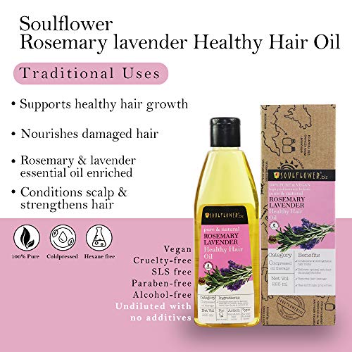 Rosemary lavender hair oil supports healthy hair growth and nourishes damaged hair. Soulflower rosemary lavender healthy hair oil conditions scalp & strengthens hair; Soulflower rosemary lavender oil is ideal for all hair and scalp problems. Rosemary lavender hair oil penetrates deep into the roots and provides it with revitalizing and strengthening nutrition